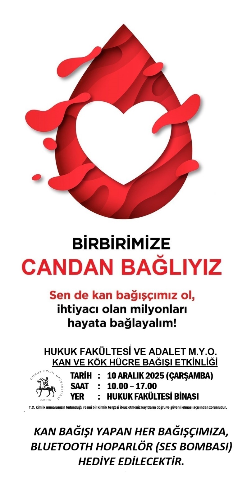DEÜ HUKUK FAKÜLTESİ VE ADALET MESLEK YÜKSEKOKULU KAN VE KÖK HÜCRE BAĞIŞI ETKİNLİĞİ / 10 ARALIK 2025 ÇARŞAMBA / SAAT: 10.00 – 17.00 28-11-2025