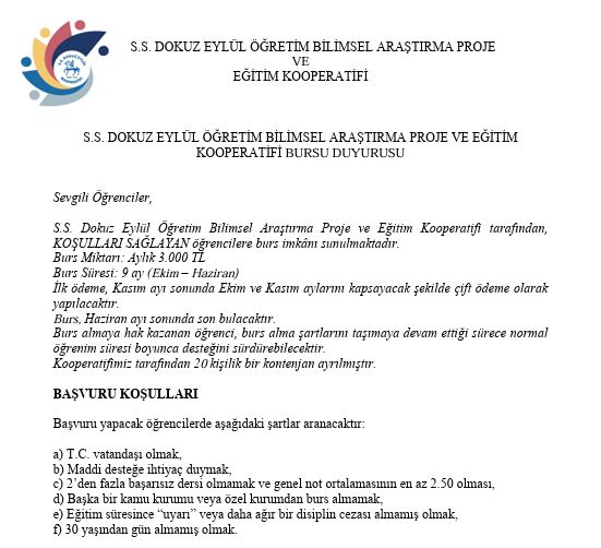 S.S. DOKUZ EYLÜL ÖĞRETİM BİLİMSEL ARAŞTIRMA PROJE VE EĞİTİM KOOPERATİFİ BURSU