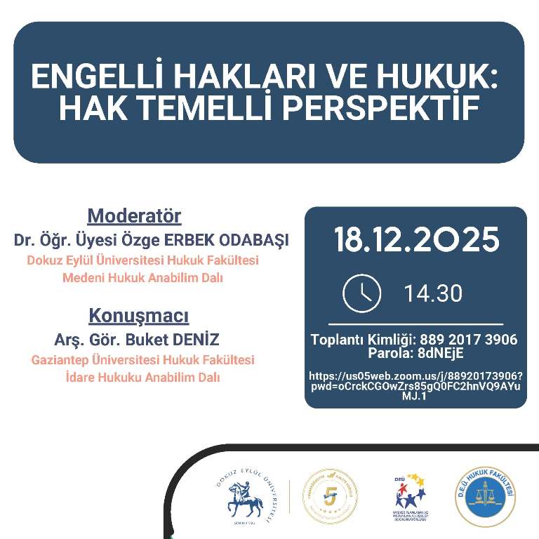 ENGELLİ HAKLARI VE HUKUK: HAK TEMELLİ PERSPEKTİF 18-12-2025 Toplantı Link: https://us05web.zoom.us/j/88920173906?pwd=oCrckCGOwZrs85gQ0FC2hnVQ9AYuMJ.1